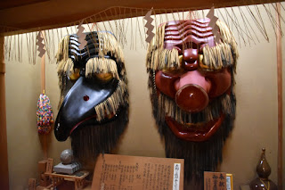 本殿を左の方に進むと、たくさんの天狗のお面などが飾られていました。