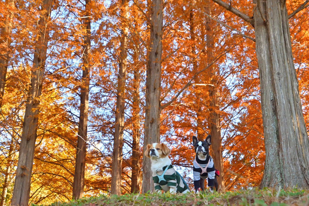 芝生広場の近くには「ツリーハウス」という子供向けの建物があります。ツリーハウスを覆っているメタセコイアの紅葉もとても慰霊でした。